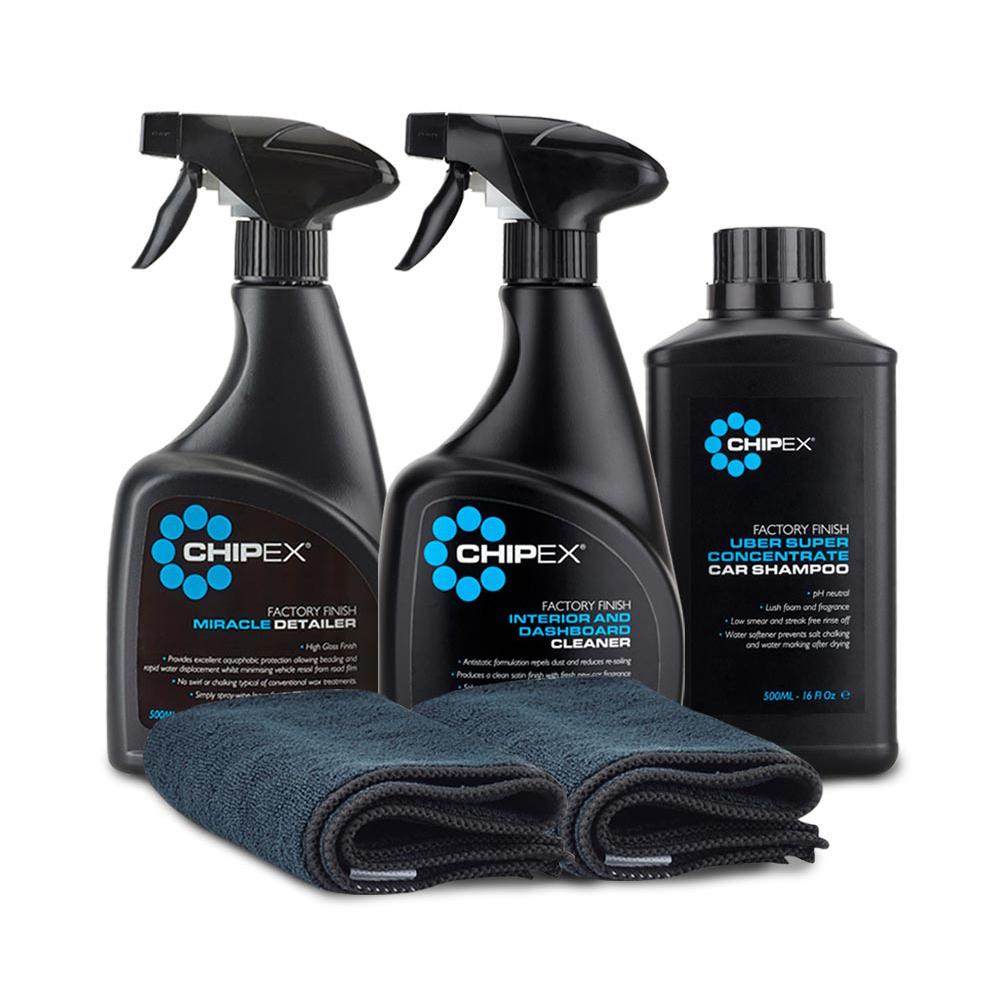 The Chipex Uber Super Concentrate Car Shampoo uses the latest innovative surface-active technology to clean your car’s bodywork. Leaving it not only sparklingly clean and smear-free but with a protective electrostatic film to help reduce future re-soiling, thereby reducing the frequency of future cleans. Use with Miracle Detailer to give your car a high shine gloss with surface protection to repel rain and vehicle re-soiling. While Chipex’s Interior & Dashboard cleaner uses the latest available surface technology to remove dust and dirt from your vehicle’s interior surfaces, leaving your car with a satin factory finish whilst imparting a classic new car fragrance.
